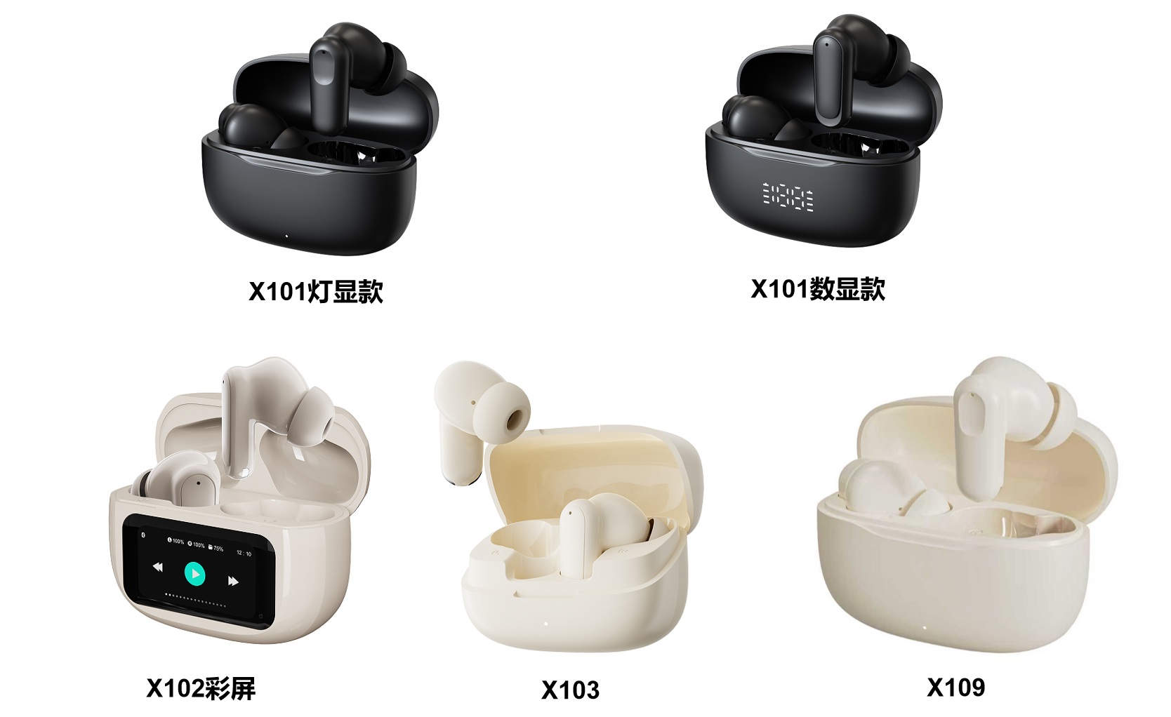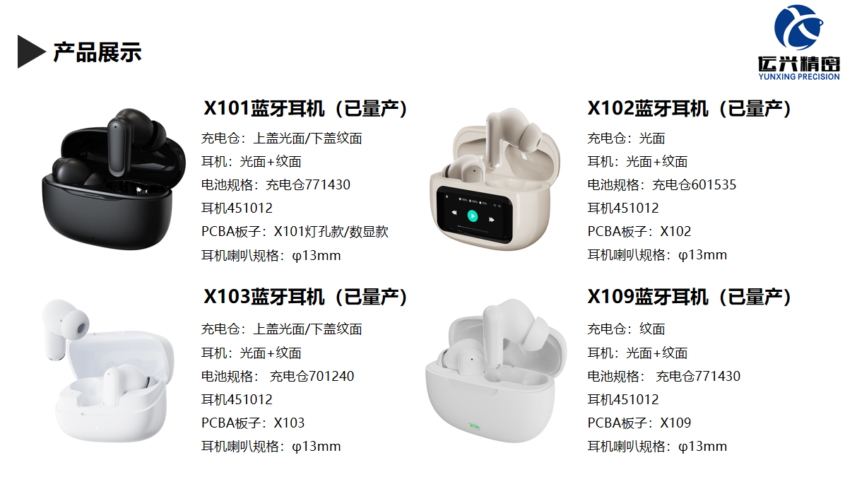 一,X101机型有灯效款和数显款两种壳料可选,透光壳料一体成型,平衡设计美感和耳机手感。充电仓电源管理芯片采用懂电科技自研的DD520芯片,充电电流200mA,静态功耗<10uA,可外挂OVP和NTC。 二,X102彩屏仓机型,彩屏仓采用杰理最新的AC7076A3芯片,待机功耗<150uA,刷屏流畅,性价比更高。 三,X103和X109机型,充电仓电源管理芯片均采用懂电科技自研的DD505芯片,充电电流200mA,静态功耗<10uA,可外挂OVP和NTC。